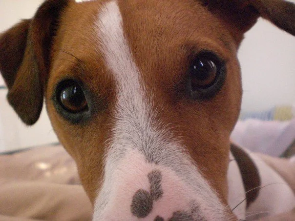 Detailed black and white drawing of a cute puppy with large eyes looking at the camera, with a soft blanket underneath.