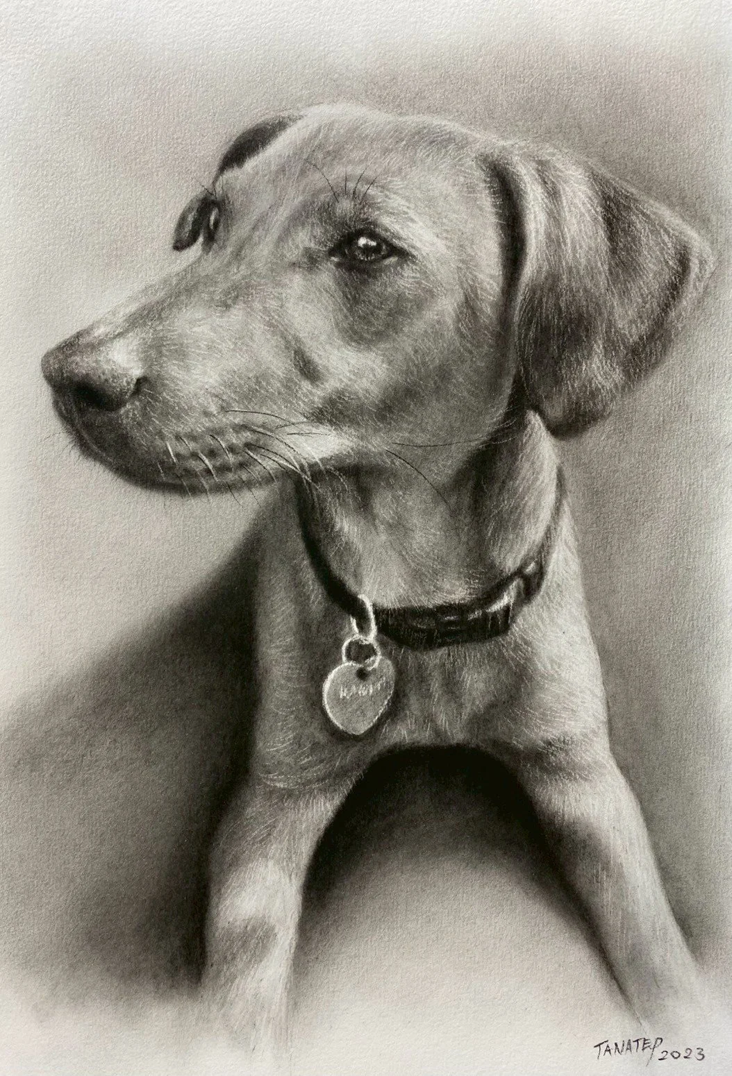 A black-and-white pencil drawing of a dog with short fur, focused sideways, wearing a collar with a round tag. The artist's signature and the year 2023 are at the bottom right corner.