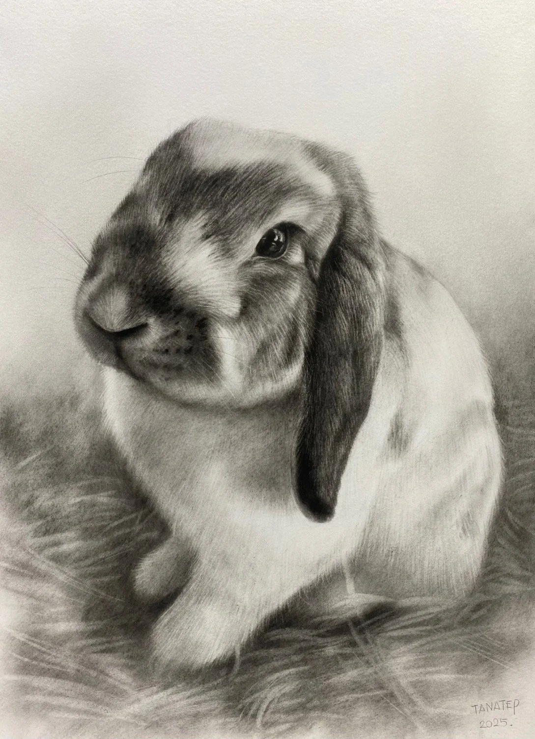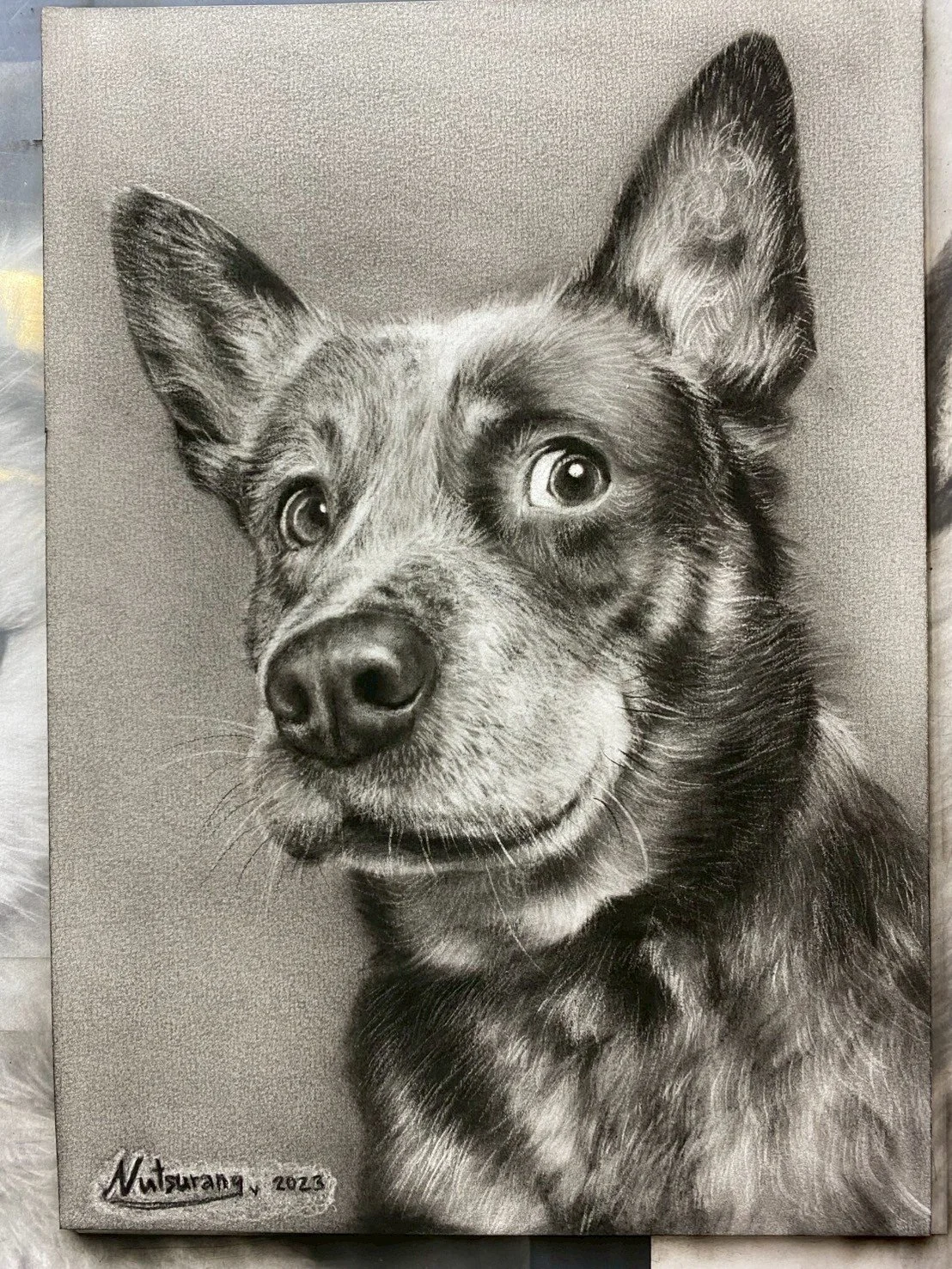 Black and white drawing of a dog with large ears, possibly a border collie mix, with detailed fur and expressive eyes.