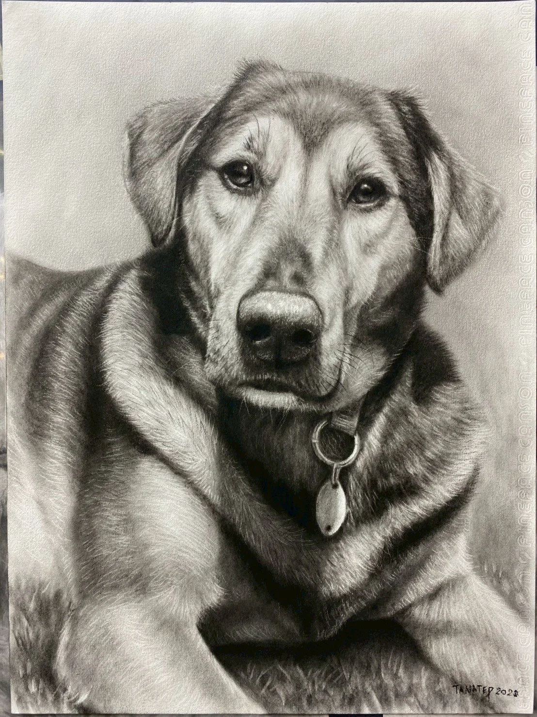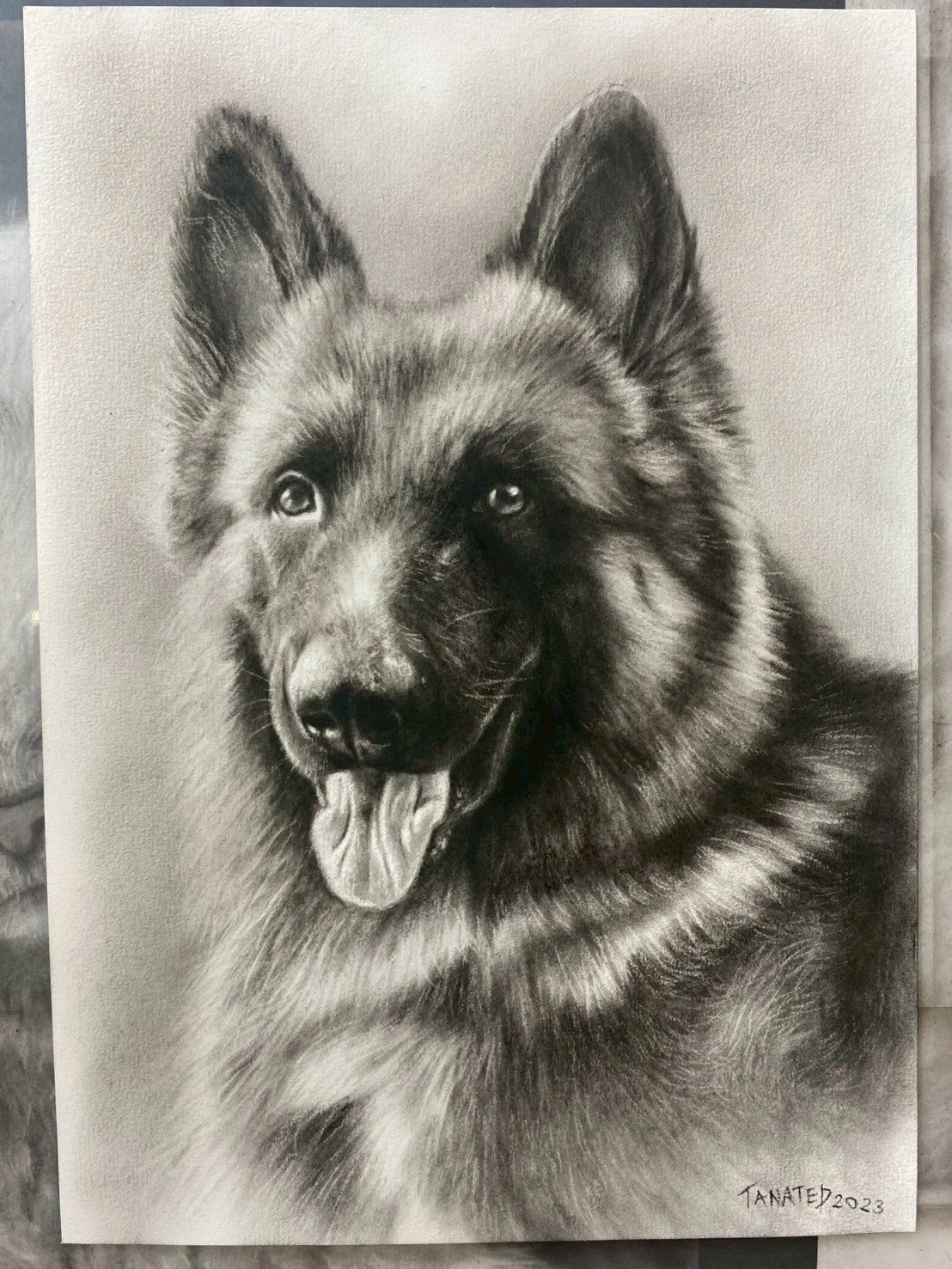 A realistic pencil drawing of a German Shepherd dog with detailed fur and expressive eyes, showing the dog with its mouth slightly open and tongue out, signed TANATE 2023.