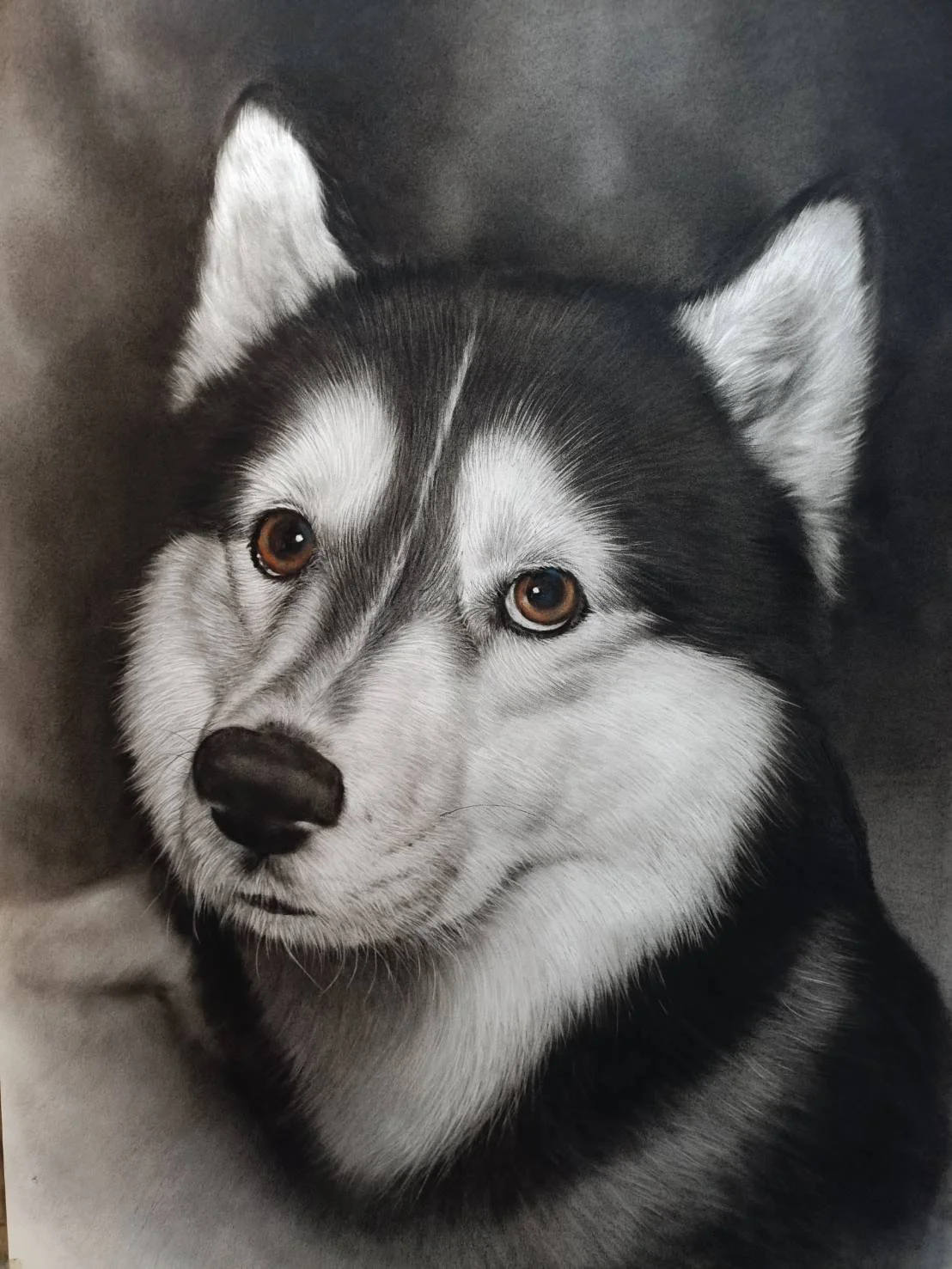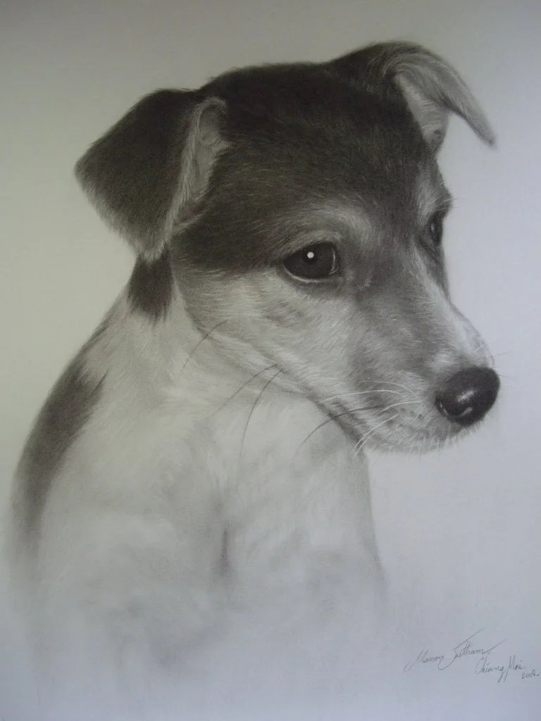 A realistic pencil drawing of a dog's face, showing detailed fur texture and expressive eyes.