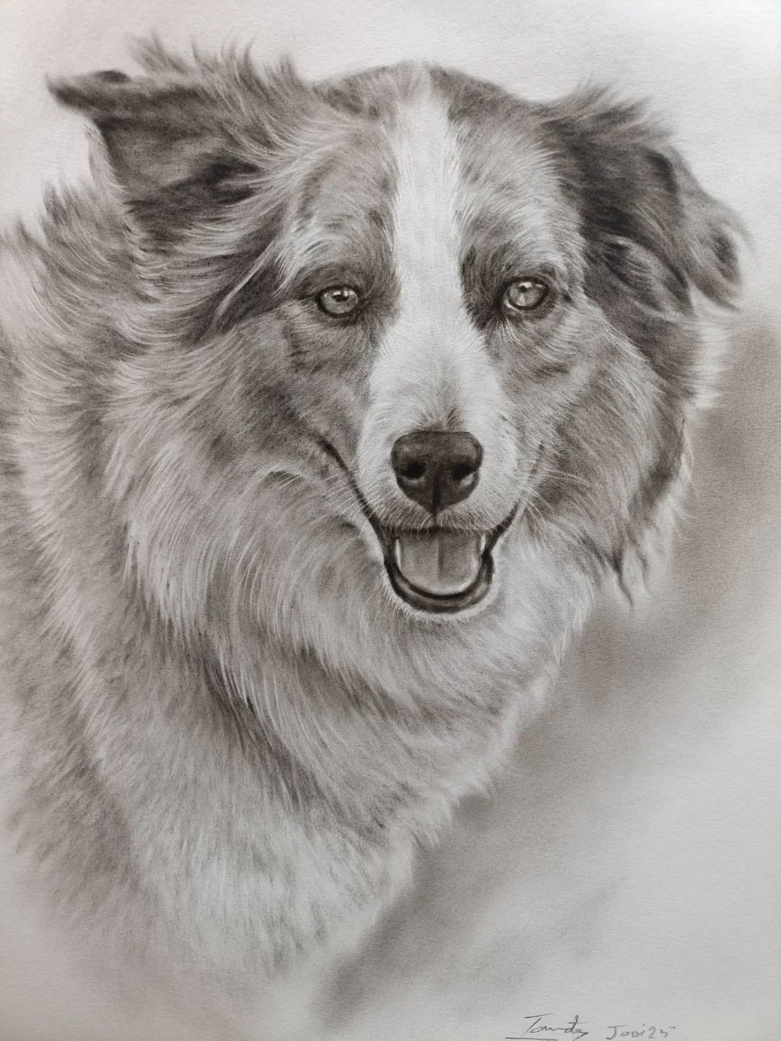 A detailed pencil drawing of a smiling Australian Shepherd dog with a fluffy coat and piercing eyes.