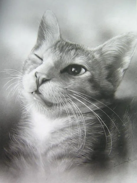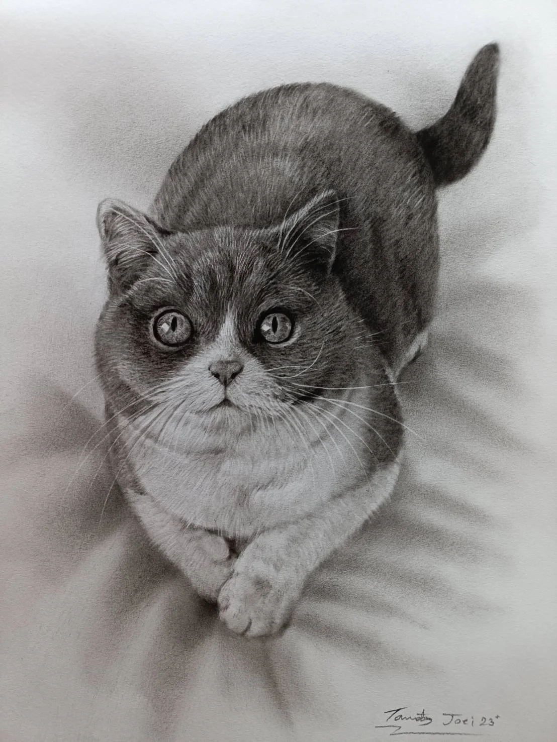 A detailed pencil sketch of a cat with large eyes, facing the camera, with one paw lifted, on a soft surface.