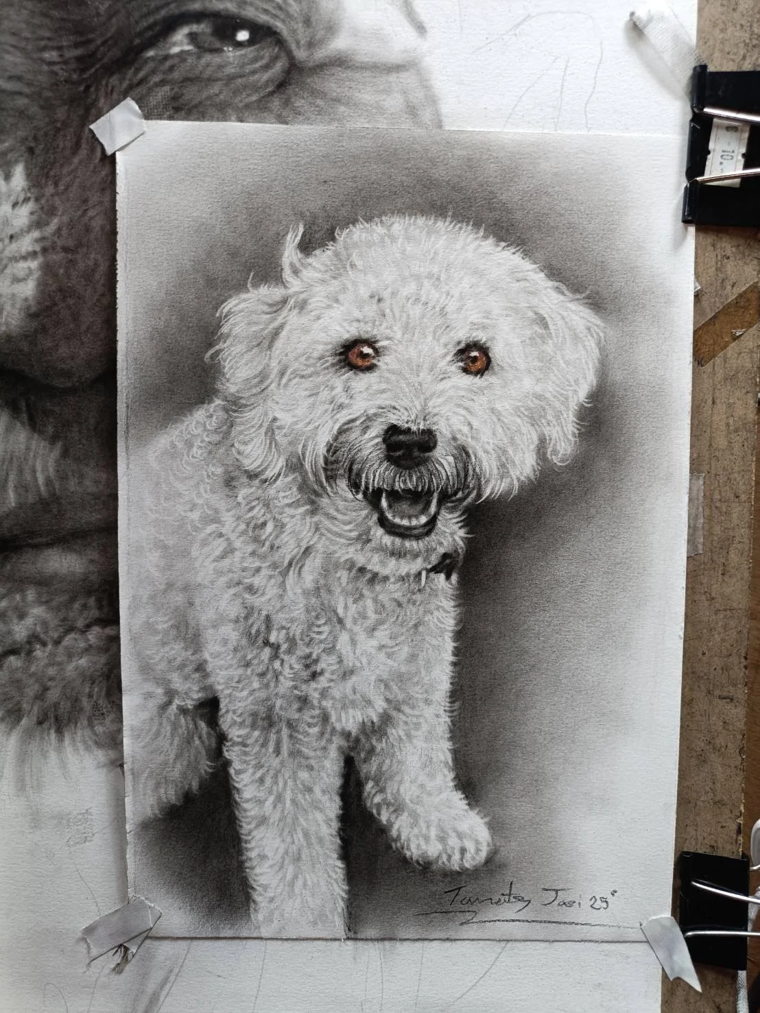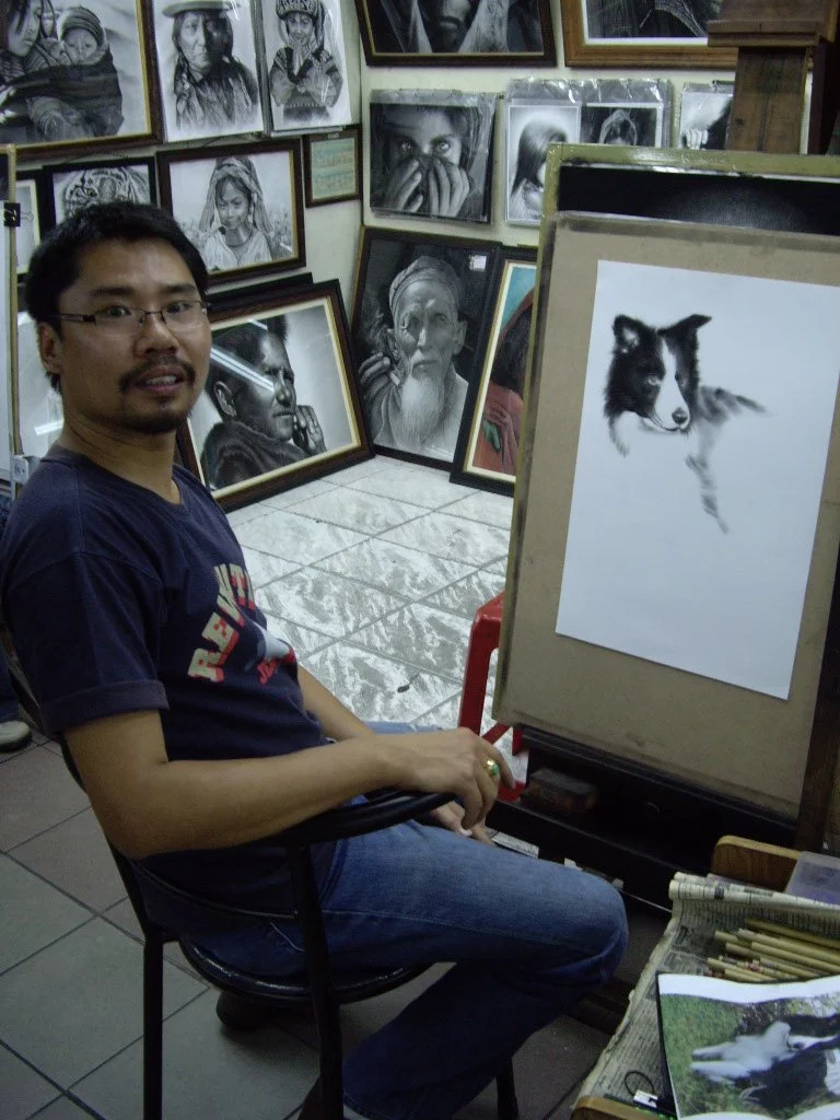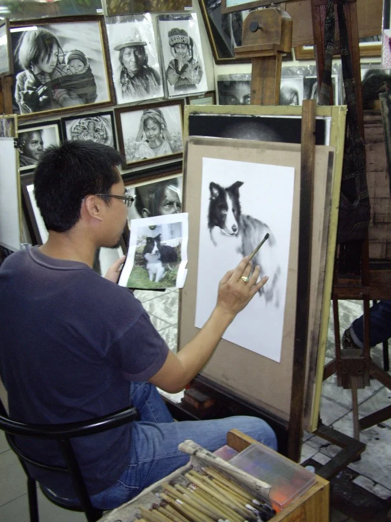 An artist creating a charcoal drawing of a dog, referencing a photograph he holds, in an art studio with framed portrait artworks hanging on the wall behind him.