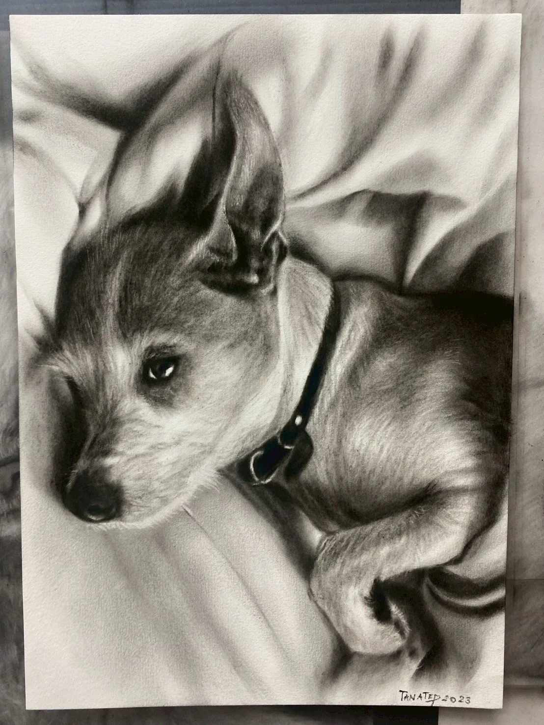 A detailed pencil drawing of a cute puppy with large eyes and floppy ears, sitting on a textured blanket.