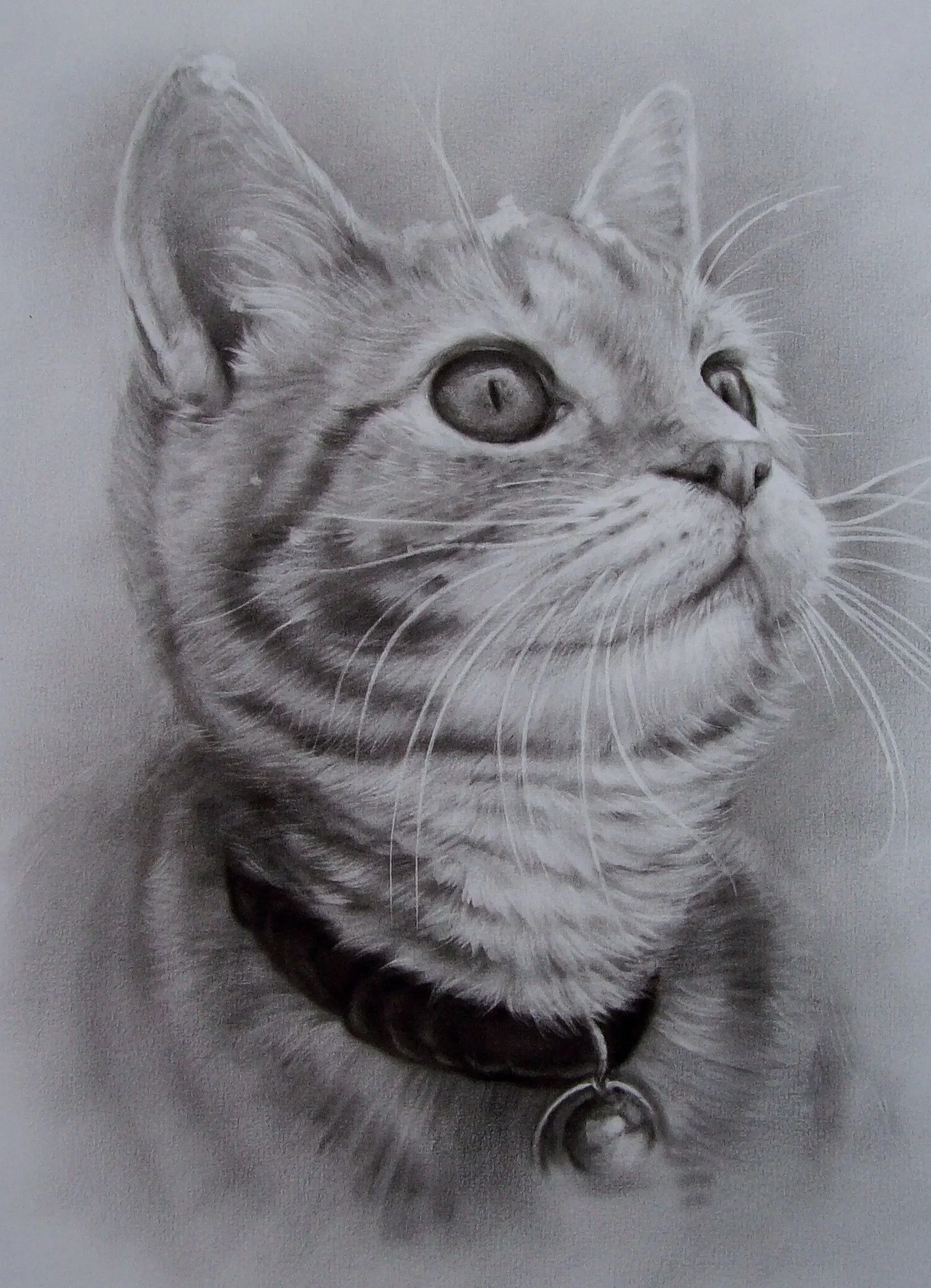 A detailed pencil drawing of a tabby cat with green eyes, looking upward with an attentive expression. The cat has distinctive markings on its face and body, with a blurred background.