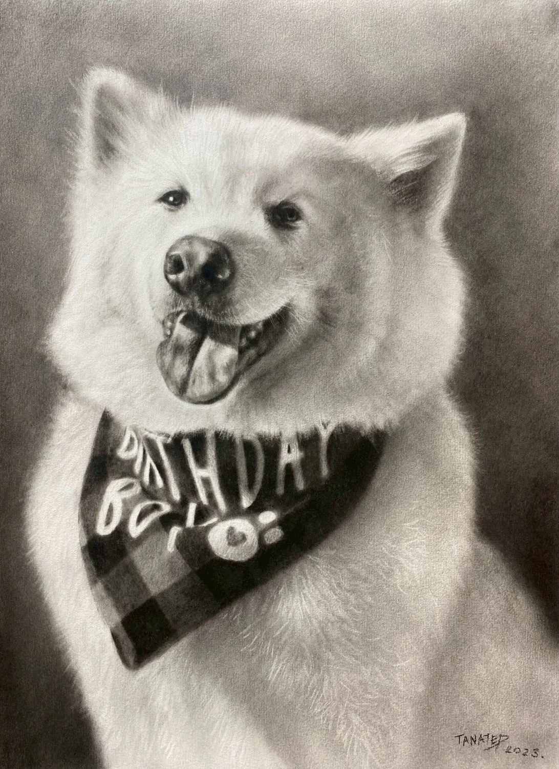 A drawing of a happy, smiling dog wearing a birthday bandana.