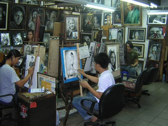 People at an art studio painting and sketching portraits, surrounded by framed photographs and paintings of various individuals.